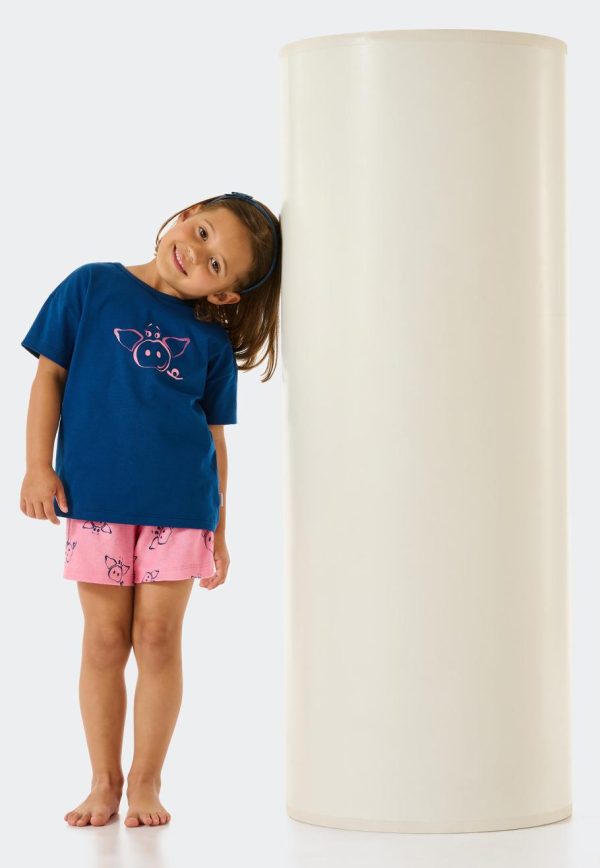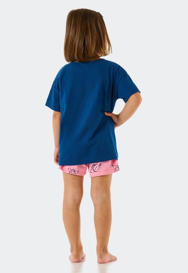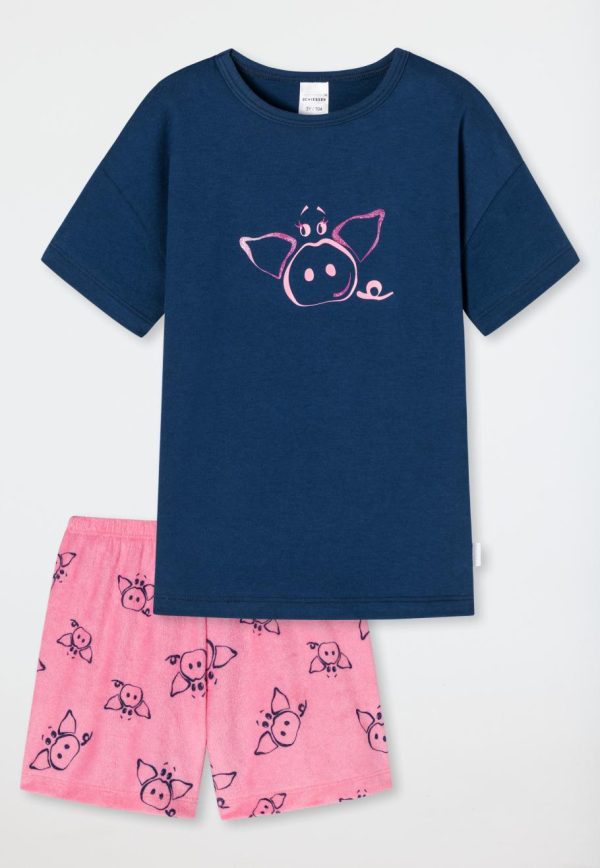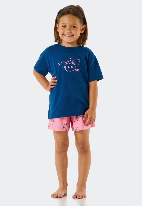 Aufgepasst, hier kommt euer neuer kurze Mädchenschlafanzug mit der extra Portion Glück! Das blaue Oberteil ist mit seinem niedlichen und angedeuteten Schweinchen-Print ein echter Gute-Laune-Bringer. Das Single Jersey-Material aus 100% softer Bio-Baumwolle fühlt sich zudem herrlich weich auf der Haut an. Die pinkfarbenen Schlafshorts sind aus weichem Frottee nicht nur rundum bequem, sondern begeistern zusätzlich mit einem tierischen Allover-Muster. „Oink, Oink“ in bester SCHIESSER-Qualität.
