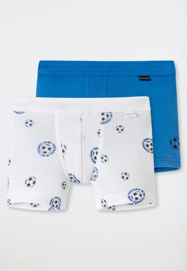 - Jungenshorts unifarben in Blau und in Weiß mit Fußball-Allover